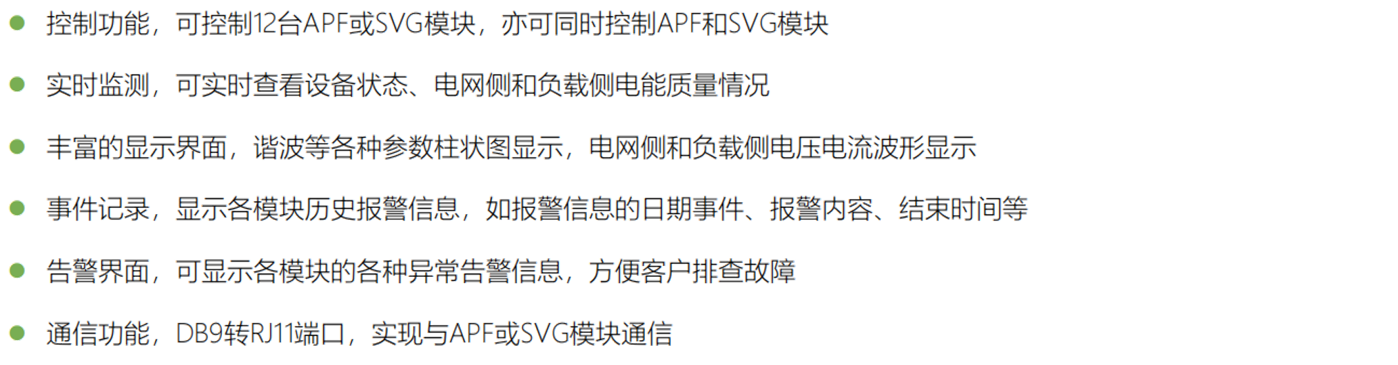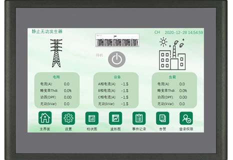 ZE-MHI觸摸屏控制器是我公司APF或SVG產品的控制單元,內置智能電能質量管理軟件,可實現控制模塊投退、參數設置、參數實時顯示、柱狀圖、波形圖等功能,控制器功能全面、安裝使用靈活、中文菜單、操作直觀方便。 觸摸屏具有串口通信接口,配置Modbus通信協議,與APF和SVG模塊聯機,上傳數據下發控制,實現用戶對APF和SVG模塊的控制和管理。